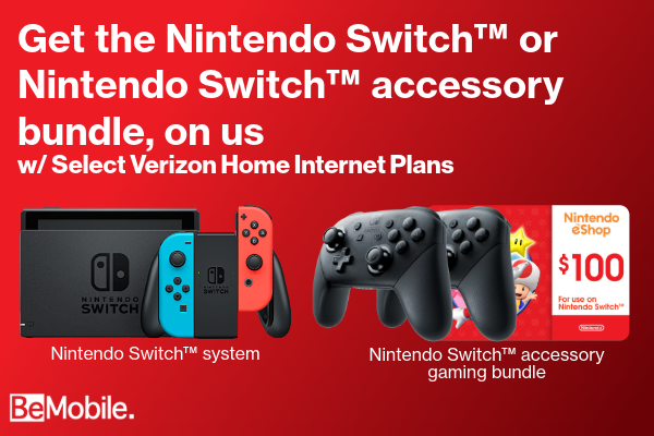 Get your game on when you sign up for select Verizon Home Internet plans. Choose between a Nintendo Switch™ Console or an accessory gaming bundle featuring two Pro Controllers and a $100 Nintendo eShop gift card. It’s fun you can play at home or on the go, on us.