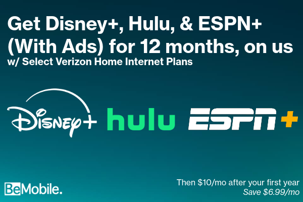 Kick back with your favorite shows, sports, and movies — on us. Sign up for select Verizon Home Internet plans and enjoy a full year of the Disney+, Hulu & ESPN+ (With Ads) bundle, a $203.88 value. After your first year, keep streaming for just $10/month through eligible plans.