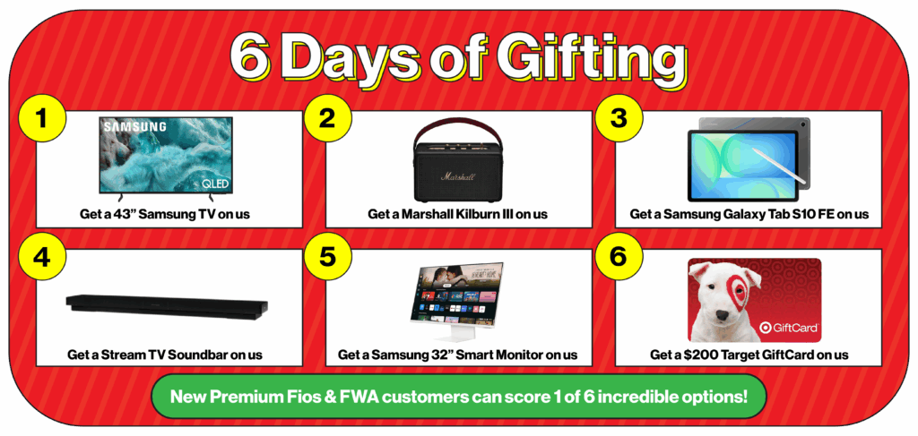 From TVs and tablets to speakers and gift cards, new Premium Fios and FWA customers get to pick one of six amazing perks. Holiday shopping just got a whole lot sweeter.